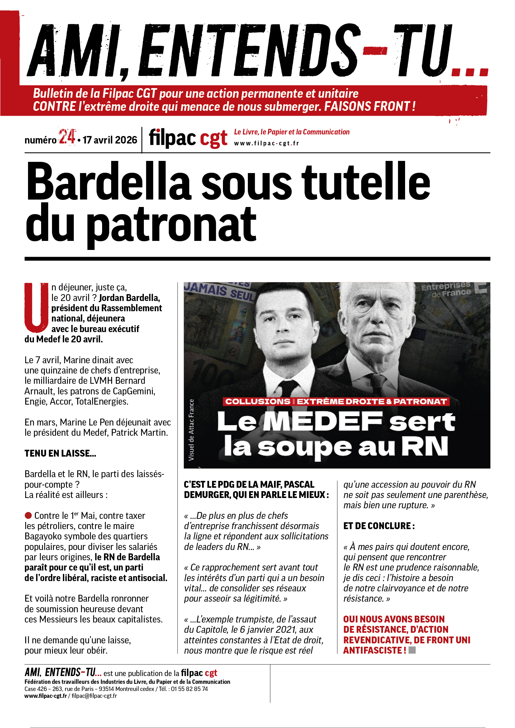 - Contre le 1er Mai, contre taxer les pétroliers, contre le maire Bagayoko symbole des quartiers populaires, pour diviser les salariés par leurs origines, le RN de Bardella paraît pour ce qu’il est, un parti de l’ordre libéral, raciste et antisocial.