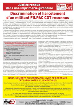 Notre délégué syndical, Monsieur F. C., a été reconnu victime de harcèlement et discrimination syndicale et indemnisé, comme d’ailleurs le syndicat du Livre de Bordeaux.