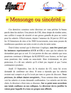 Était-il donc normal que le directeur s’explique, sans être passé par les instances représentatives (CCE et CE) et sans que les salariés lui demandent quoi que ce soit. Il s’est permis de dire aux salariés que nous pourrions continuer à fabriquer du KLEENEX sous licence, en bref que nous pourrions être vendu ou sous-traité. Bien évidemment, en père protecteur, il a dit aux salariés qu’il n’était pas inquiet et que l’usine continuerai à produire.