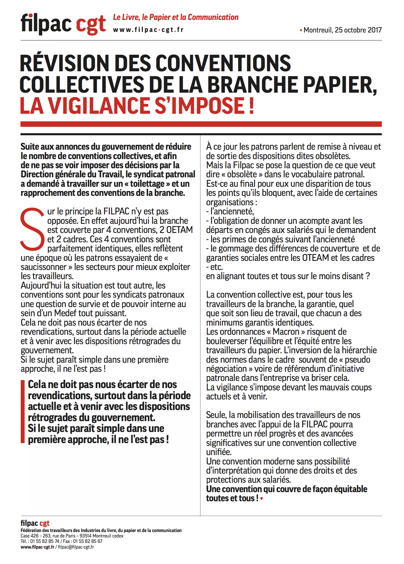 Les ordonnances « Macron » risquent de bouleverser l’équilibre et l’équité entre les travailleurs du papier. L’inversion de la hiérarchie des normes dans le cadre souvent de « pseudo négociation » voire de référendum d’initiative patronale dans l’entreprise va briser cela.