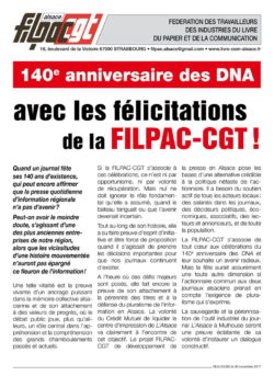 La FILPAC-CGT s’associe de tout cœur aux célébrations du 140e anniversaire des DNA et leur souhaite un avenir radieux. Mais la fête aurait assurément une toute autre dimension si l’actionnaire commun aux deux journaux alsaciens prenait en compte l’exigence de pluralisme qui s’exprime.