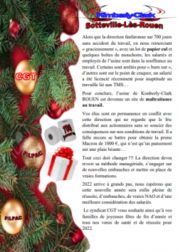 Le syndicat CGT vous souhaite ainsi qu’à vos familles de joyeuses fêtes de fin d’année et tous nos vœux de santé et de réussite pour 2022.