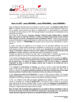 En réaction, des luttes sont engagées sur tout le territoire et sur des thématiques différentes mais souvent complémentaires et depuis plusieurs semaines les mobilisations ne manquent pas. Pour autant, le bureau du Comté Régional Aquitaine réuni le 28 mai 2018 constate que le mouvement de contestation doit encore s’élargir, se développer, s’étendre et retrouver le sens solidaire quicaractérisera le grand moment social nécessaireen opposition adéquate au projet destructeur porté par les dirigeants du moment.