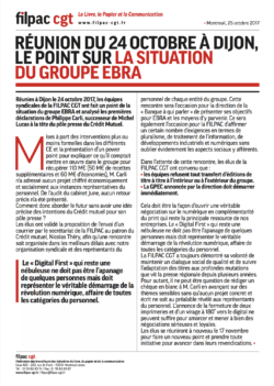 Réunies à Dijon le 24 octobre 2017, les équipes syndicales de la Filpac-CGT ont fait un point de la situation du groupe EBRA et analysé les premières déclarations de Philippe Carli, successeur de Michel Lucas à la tête du pôle presse du Crédit Mutuel.