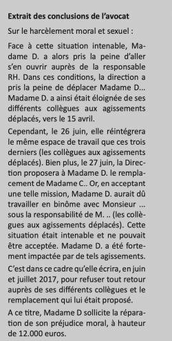 Dès le bureau de conciliation du conseil des prud’hommes, Ondulys a admis ses tords. La direction a consenti à verser la somme intégrale demandée par notre jeune collègue Claire pour préjudice moral lié au harcèlement sexuel et agissements sexistes, soit 12000€.