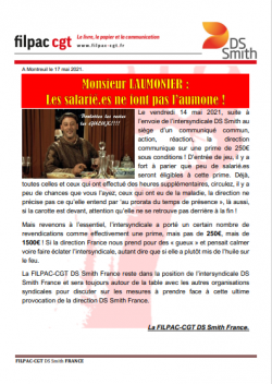 La FILPAC-CGT DS Smith France reste dans la position de l’intersyndicale DS Smith France et sera toujours autour de la table avec les autres organisations syndicales pour discuter sur les mesures à prendre face à cette ultime provocation de la direction DS Smith France.