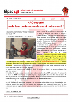 Alors que lors de la conférence téléphonique du 16 mars, la direction, par le biais de monsieur Olivier LAURENT martelait qu’il fallait coute que coute maintenir la réunion des NAO du 17 mars, ce matin, revirement de position, la réunion est annulée ! C’est ce que les OS demandaient à cet entretien téléphonique, mais bon !