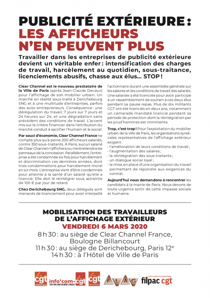 Clear Channel est le nouveau prestataire de la Ville de Paris (après Jean-Claude Decaux) pour l’affichage de son mobilier urbain. Un marché en réalité sous-traité à Derichebourg SNG et à une multitude d’entreprises, parfois des auto-entrepreneurs. Conséquence : une dérégulation du travail, 7 jours sur 7 jours et 24 heures sur 24, et une dégradation sans précédent des conditions de travail. L’accent mis sur le critère financier dans l’attribution du marché conduit à sacrifier l’humain et le social.