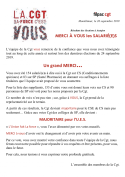L’équipe de la Cgt vous remercie de la confiance que vous nous avez témoignée tout au long de cette année et surtout lors des dernières élections du 24 septembre 2019.