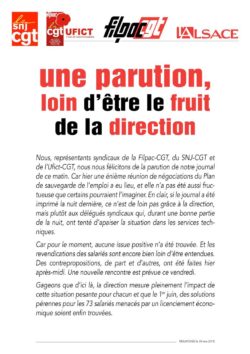 Nous, représentants syndicaux de la Filpac-CGT, du SNJ-CGT et de l’Ufict-CGT, nous nous félicitons de la parution de notre journal de ce matin. Car hier une énième réunion de négociations du Plan de sauvegarde de l’emploi a eu lieu, et elle n’a pas été́ aussi fructueuse que certains pourraient l’imaginer. En clair, si le journal a été́ imprimé la nuit dernière, ce n’est de loin pas grâce à la direction, mais plutôt aux délégués syndicaux qui, durant une bonne partie de la nuit, ont tenté d’apaiser la situation dans les services techniques.